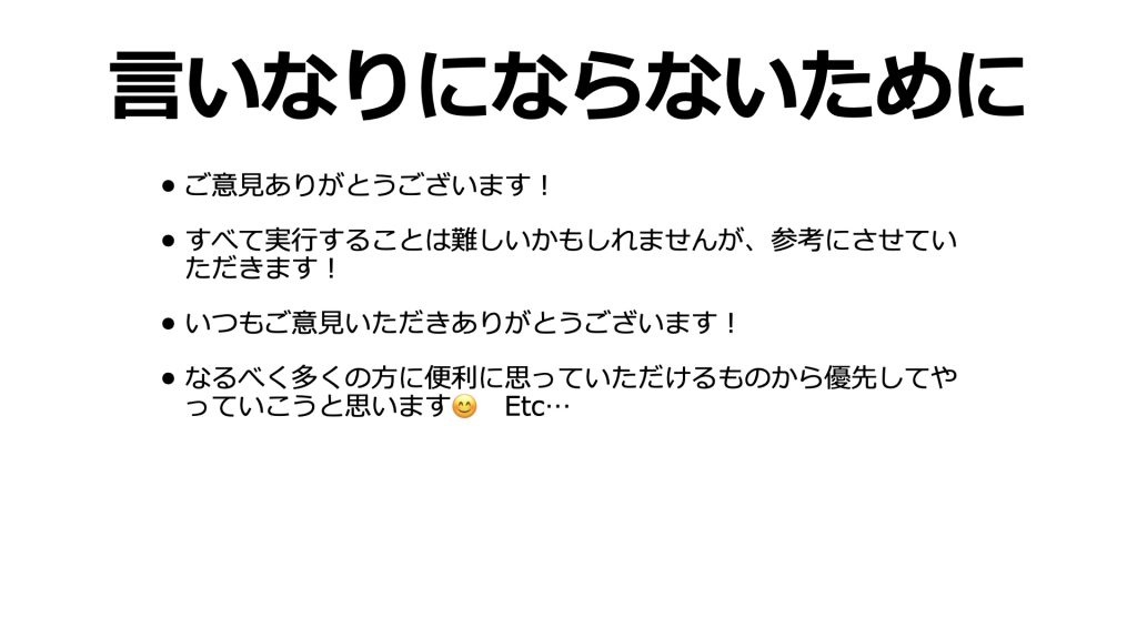 例えば何か言われたとき、「ありがとうございます、やります!」とかじゃなくて、「ご意見ありがとうございます!」とか、「全て実行することは難しいかもしれませんが参考にさせていただきます」「いつもご意見いただきありがとうございます!」など、とりあえず「すぐやるわけではない」ということを暗に伝えつつ、「なるべく多くの方に便利に思っていただけるものから優先してやっていこうと思います」と伝えるなど、「やります」と勢いで言わないという感じですかね。