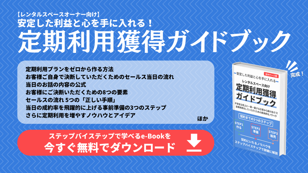定期利用プランの種類については、「レンタルスペースの利益向上に必要な3種類の定期利用プランを知る」の記事でさらに詳しく解説しています。