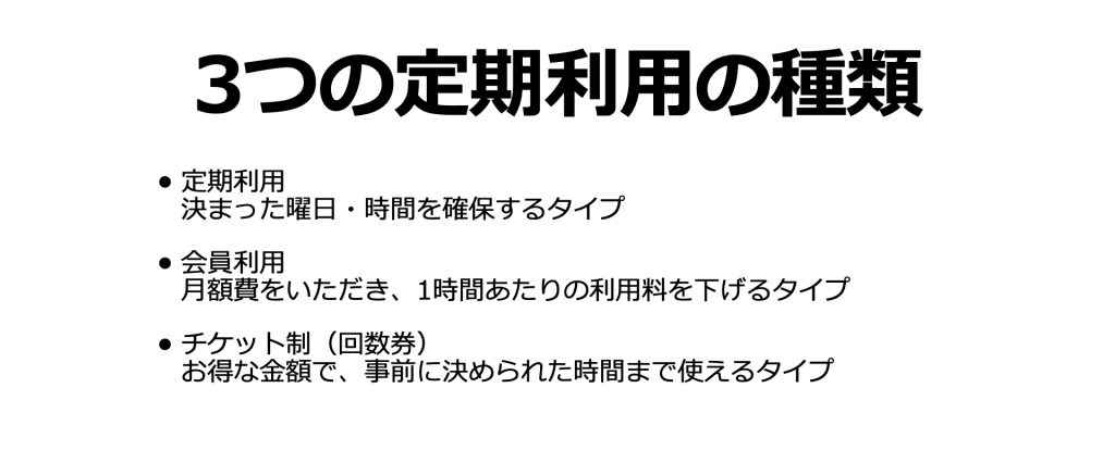 これらの2つのポイントに気をつけながら、今回の記事でご紹介した流れに沿ってあなたのスペースに合った定期利用プランを作ってみてください。