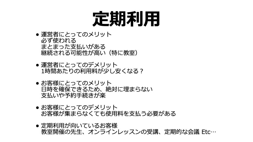 - 【定期利用プラン】運営者にとってのデメリット:1時間あたりの利用料が少し安くなりがち