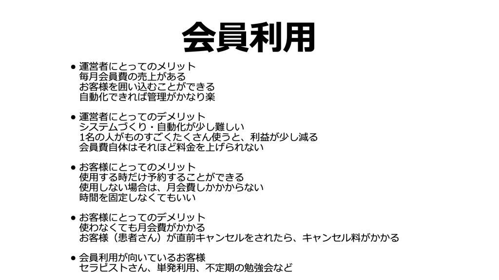 - 【会員利用プラン】運営者にとってのメリット:毎月月会費の売上がある。自動化できれば予約区管理が楽。お客さまを囲い込める