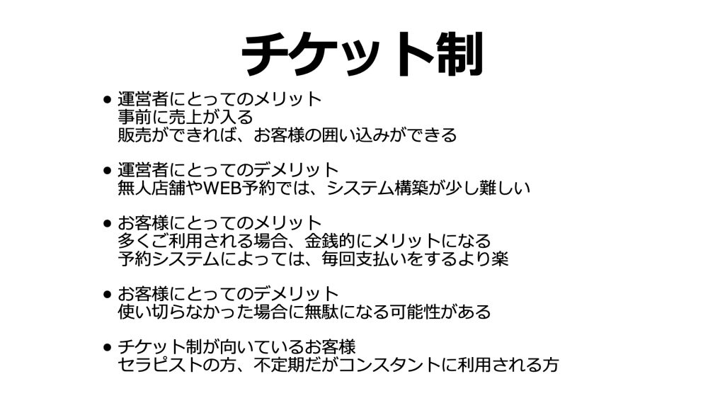 - 【チケット制(回数券)】運営者にとってのメリット:事前に売上が入る。お客さまの囲い込みができる。