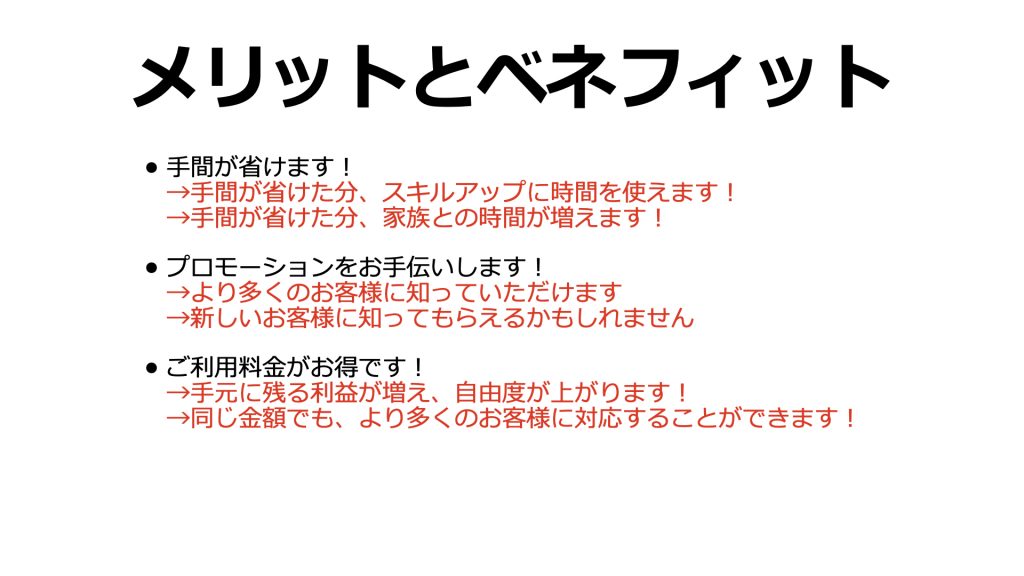 そういうときに、ご予約の手間が省けますとなったとき、手間が省けた分スキルアップに時間を使えますとか、手間が省けた分家族との時間が増えます、みたいなのがベネフィットですね。