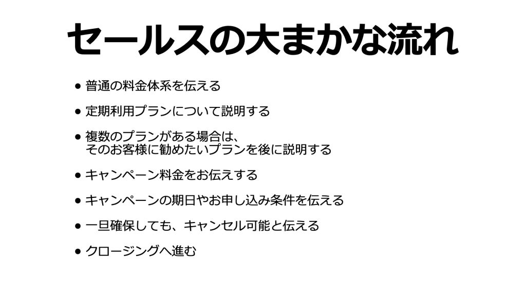 ではこのマインドを前提に、当日のセールスの流れ、5つの公式について解説していきます。