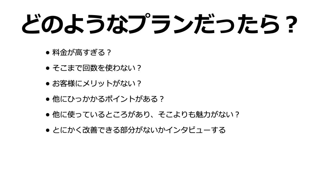 たとえば先程の例では、「この金額はどう思いますか?」とか「このプランはどう思いますか」という質問のこと。
