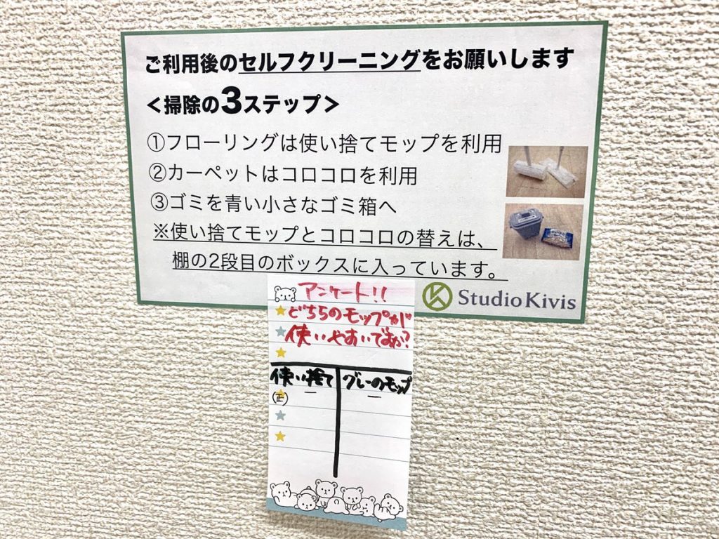 結果によって、「クイックルワイパーのまま」「レンタルモップに変更」「どちらも置いておく」のどれかにしようと考えております。