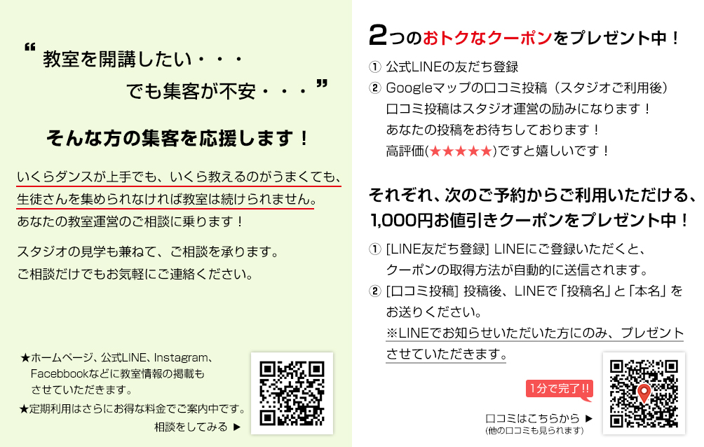 表面には基本情報が掲載されていますが、裏面には、お得にご利用いただけるクーポンの取得方法を掲載しています。