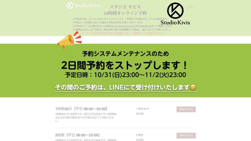 この度、予約システムのメンテナンスのため、最大2日間予約システムを停止させていただきます。