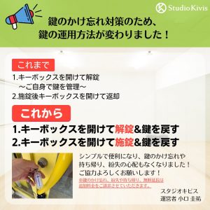 スタジオ内で鍵を探される手間もなくなりますので、便利になったかと思います。