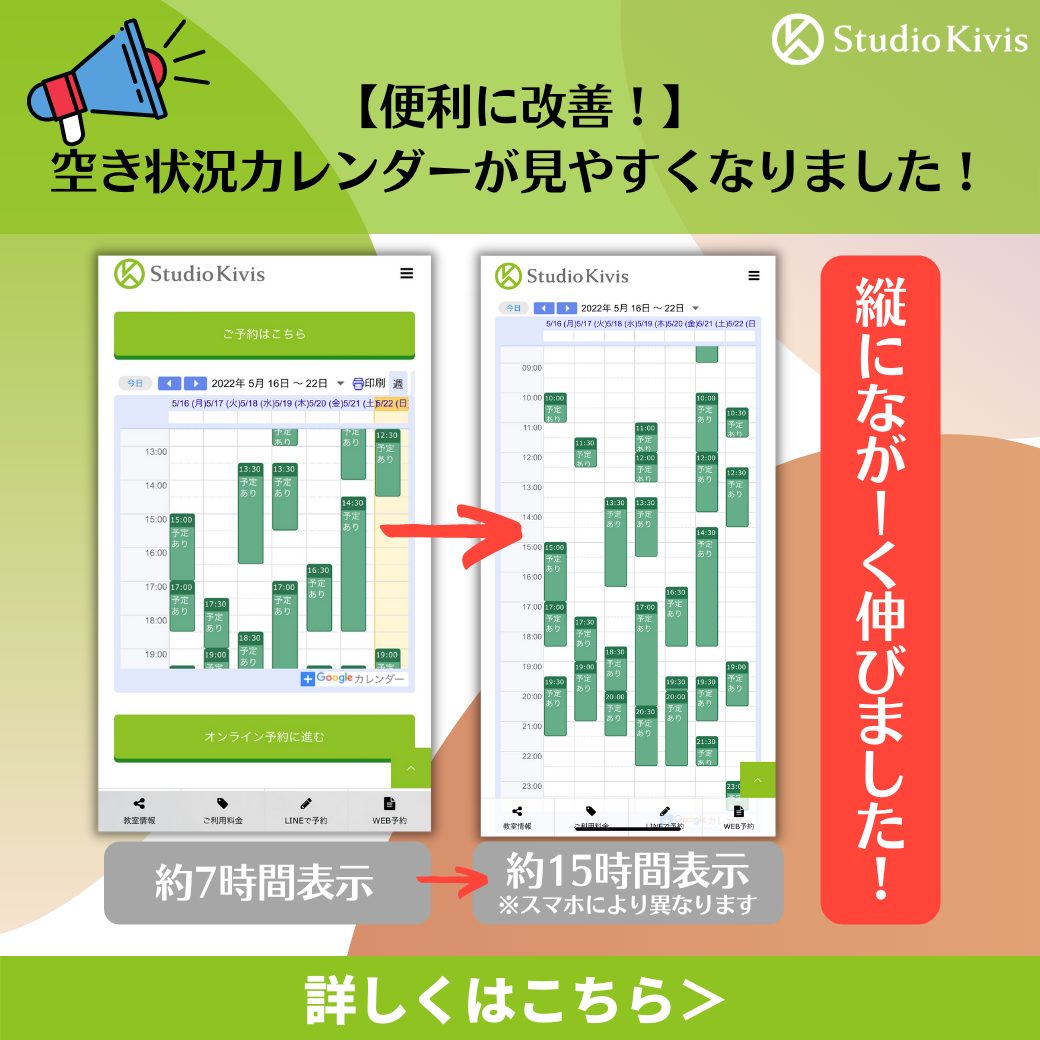 いつもご予約前にご覧いただいている「空き状況のカレンダー」ですが、縦に長く伸ばし、スマホで見やすいサイズに変更いたしました!