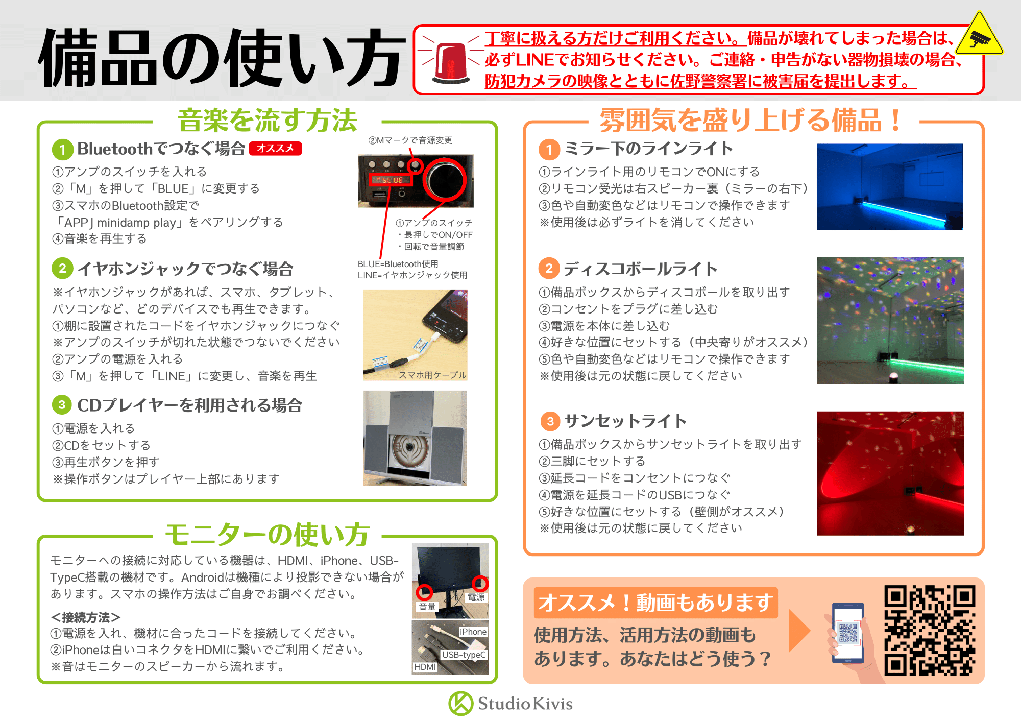 備品の使い方などはスタジオにも掲示してありますが、今後動画にもしていきますので参考にしてください。