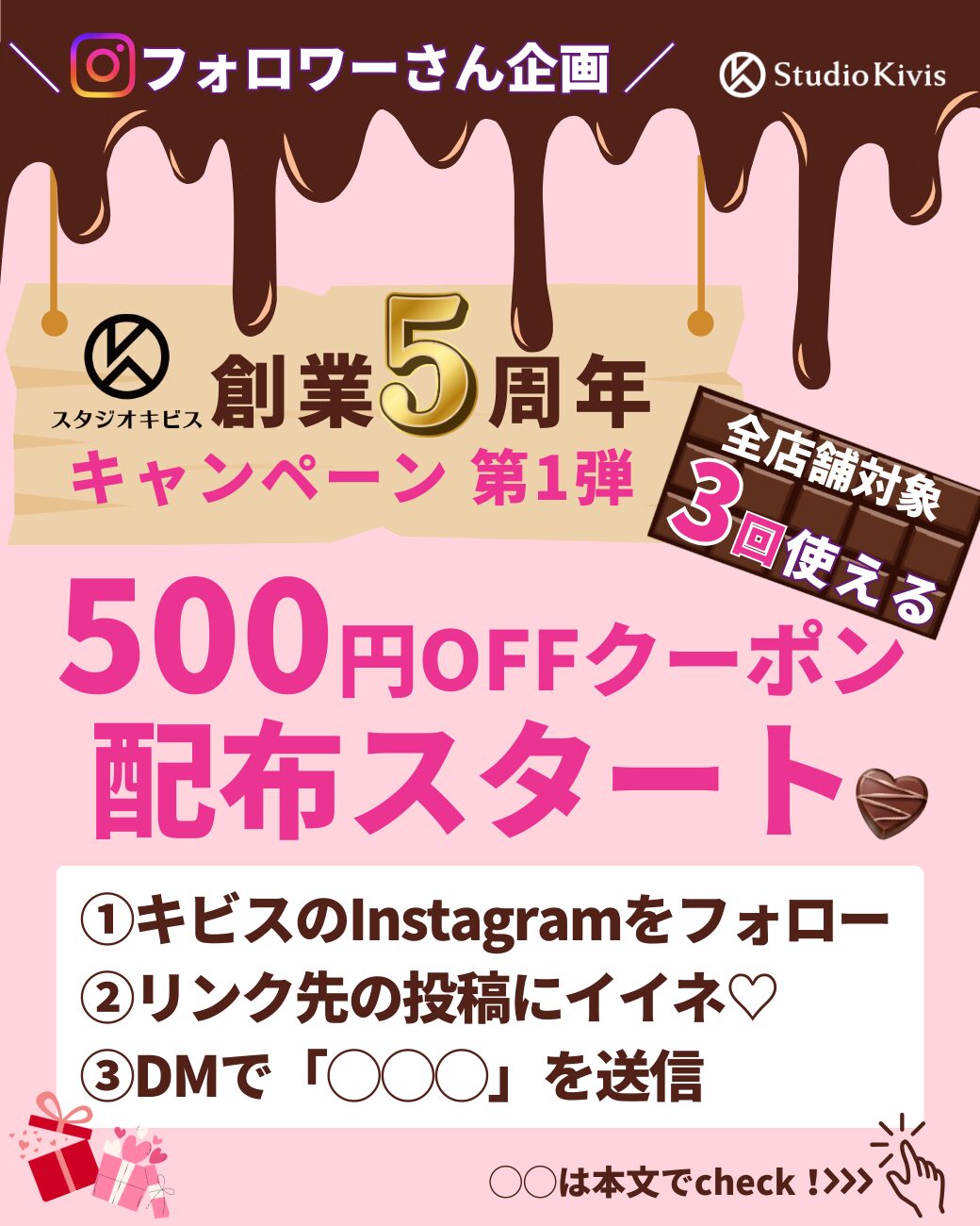 ♥️第1弾 バレンタイン編♥️では、スタジオキビス全店舗が2月末までの期間中、500円引きで”3回”もご利用いただけるお得な特別クーポンをご用意しました‼️