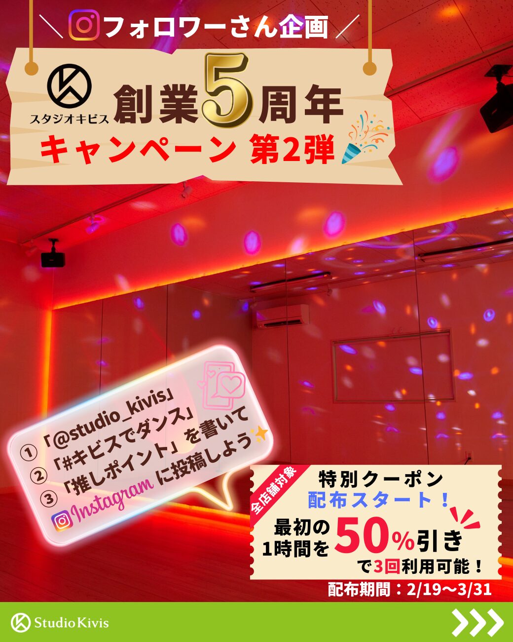 3. 【キビス創業5周年キャンペーン】第2弾 #キビスでダンス編🎊 “推しポイント”投稿で、1時間50%引き×3クーポンをゲット🎁【全店舗対象】