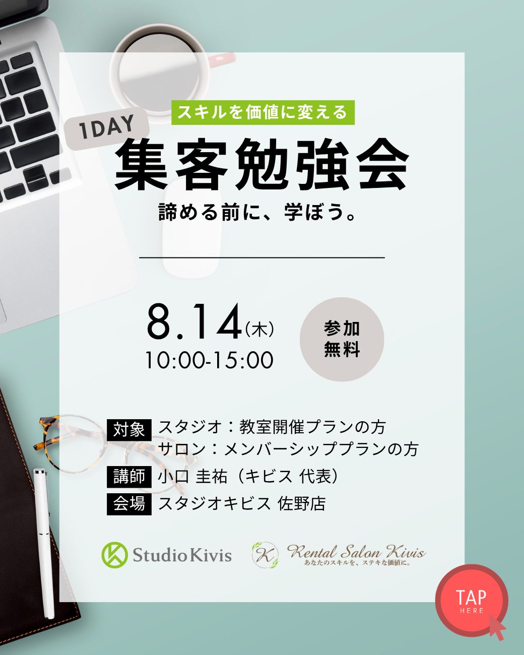 スタジオキビスの「教室開催プラン」をご利用の方と、レンタルサロンキビスの「メンバーシッププラン」をご利用のお客さまは無料でご参加いただけますので、ぜひ情報を逃さずにチェックしてください👍️