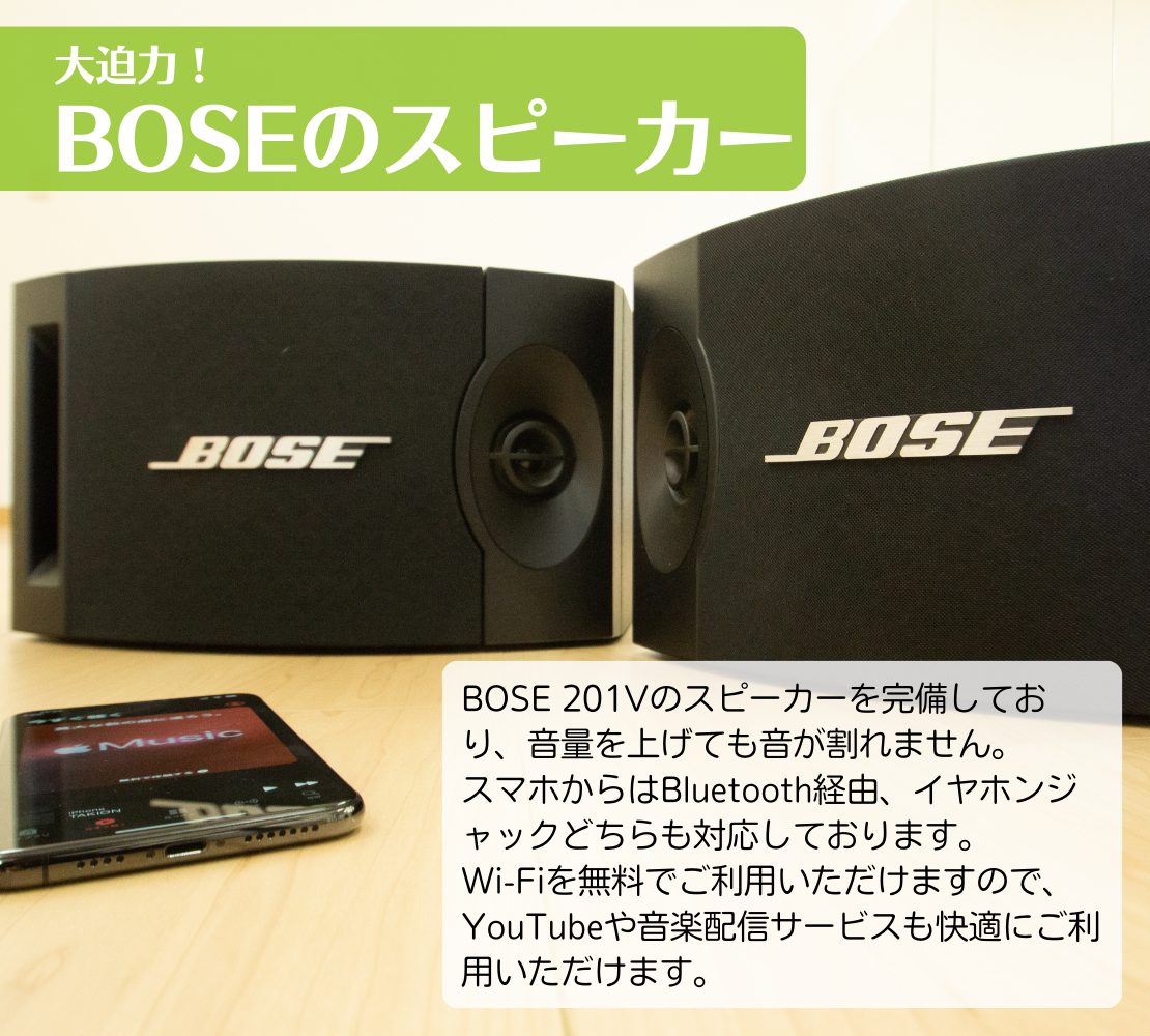 スピーカーは大迫力のBOSE 201Vを天井に完備。Bluetooth接続でスマホから大好きな音楽を流すことができます。