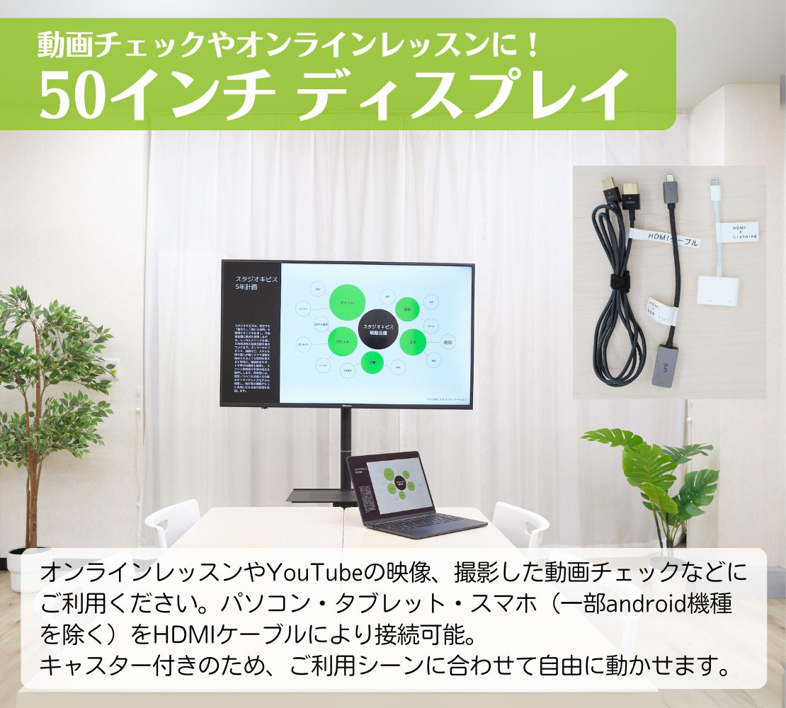 大画面の50インチディスプレイは、パソコン・タブレット・スマホ(一部android機種は映らない場合があります)をHDMIケーブルにより接続できます。