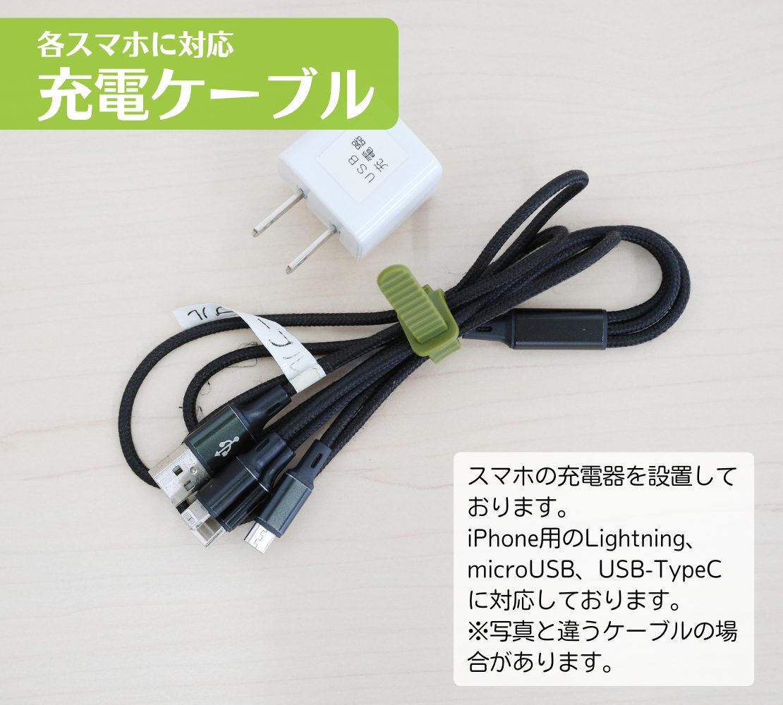 - スマホ用充電ケーブル(USB-C/Lightning/micro USB)